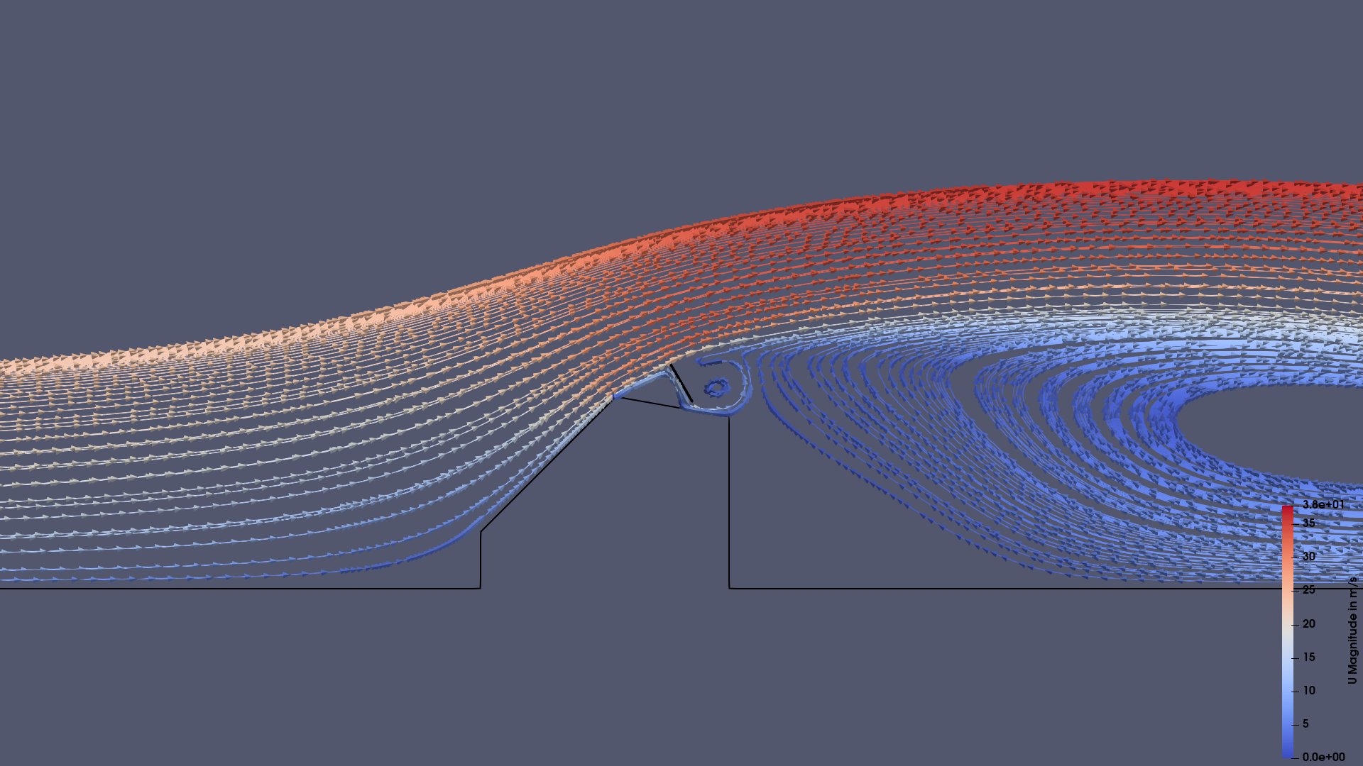 A slow motion movie of the air flow around roof and panel developing over time. In the first few seconds, the air flow representing the storm is initiated, leading to a turbulent movement. Then, the flow stabilizes to its final state. Colors depict the velocity distribution in m/s. Isn’t that pretty cool? (download video)